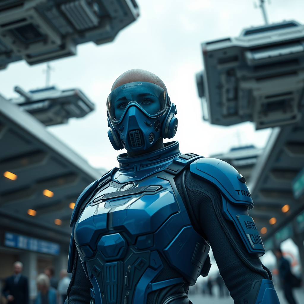 A formidable female figure in a sleek, blue sci-fi spacesuit stands poised at a bustling spaceport. She is framed by futuristic flying platforms zipping through an overcast sky. Her head is bald, gleaming under soft natural lighting, while a sophisticated sci-fi visor and respirator mask cover her face, hinting at a world where atmosphere isn't always safe. Her armor is a blend of sleek plate and isolated sections, offering a sense of both protection and mobility, textured to evoke real-world materials. The scene is captured from a low, third-person perspective, emphasizing her strength and stature. The surrounding environment, with its natural textures and blurred motion of platforms, enhances the photorealism. With cinematic rendering, light and shadow interplay dramatically across the scene, creating a moody yet vivid atmosphere. The image, rendered in 8K Ultra-HD, employs ray tracing for unparalleled detail and depth, capturing the essence of a sci-fi movie still with a sense of realism and artistic flair.