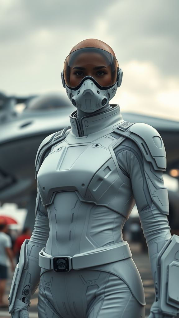 A formidable female figure in an advanced white sci-fi spacesuit stands confidently on a bustling spaceport, with a sleek sci-fi ship looming in the background under an overcast sky. She wears an intricate sci-fi visor complete with high-tech lenses and a sophisticated respirator. Her bald head is gracefully accentuated by sleek plate armor, with additional pieces of isolated armor strategically placed. Captured from a low, third-person perspective, the scene emphasizes the intricate details and craftsmanship of her attire. The composition is inspired by high-end sci-fi movies, combining natural textures and soft natural light with an artistic use of natural blur to achieve photorealism. Enhanced with cinematic rendering and ray tracing for the highest quality and detail, the image boasts ultra-HD clarity and depth in 8K resolution. The mood is enriched by dramatic lighting that highlights the dynamic interplay of shadows, offering a sense of grandeur and epic scale.