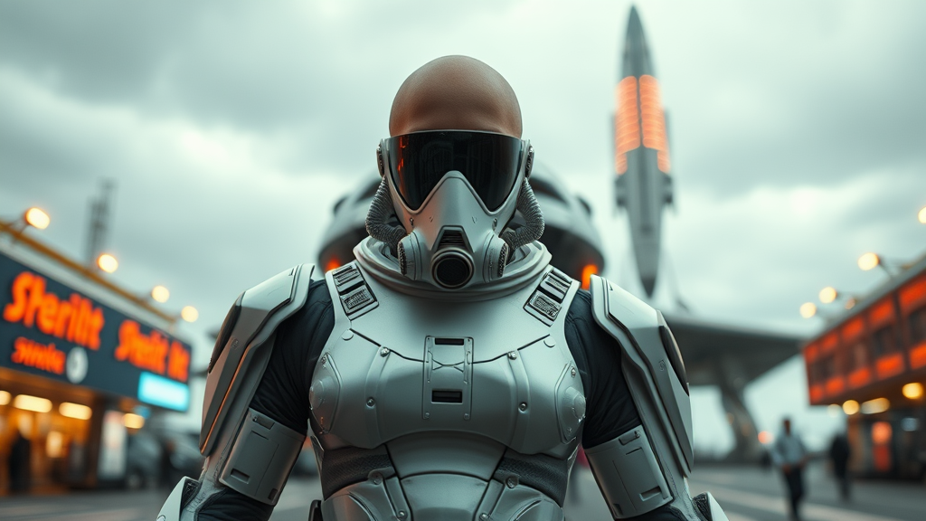 A formidable female figure stands confidently at the bustling spaceport, clad in a sleek white sci-fi suit that gleams with subtle reflections. Her attire includes a sophisticated mask integrated with a high-tech sci-fi visor and respirator, hinting at advanced technology. Her bald head adds to her striking appearance, with elements of plate armor providing both protection and isolation. Behind her, a massive sci-fi ship launches into the overcast sky, casting a dramatic backdrop to the scene. The view from below accentuates her commanding presence, with the fine details of her armor intricately rendered. The setting evokes the style of a sci-fi movie, captured with natural textures, light, and blur, achieving a photorealistic and cinematic rendering. This 8K Ultra-HD image employs ray tracing for the highest quality and a dynamic play of moody, cinematic lighting, enhanced by blur effects and a sense of long exposure to convey motion and energy.