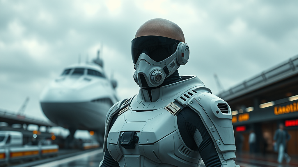 A formidable female figure stands poised in a sleek white sci-fi spacesuit on a bustling spaceport, with a futuristic ship looming in the background under an overcast sky. Her enigmatic appearance is heightened by a sophisticated mask, a high-tech sci-fi visor, and an intricate sci-fi respirator. Her bald head is framed by plate armor that seamlessly integrates with isolated pieces of advanced armor, creating a striking silhouette. Captured from a low third-person perspective, the scene is rich in fine detail, reminiscent of a high-budget sci-fi movie. The photograph conveys photorealism with natural textures, enhanced by natural and moody lighting. Cinematic effects are evident through expertly applied blur and long exposure that add depth and movement. The image is rendered with ray tracing for maximum visual impact, achieving ultra-high definition quality in 8K resolution, showcasing the atmospheric blend of natural light and cinematic ambiance.