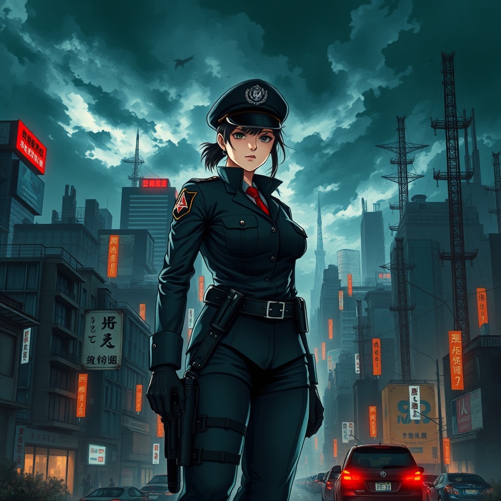 A formidable female officer, standing with authority amidst a dystopian Japanese city, the skyline lit dimly under a foreboding dark sky. In the style of manga, the scene is enriched with meticulous line work and cell shading, reflecting the essence of a graphic novel. The digital painting bursts with vibrant colors and intricate details, reminiscent of Masamune Shirow’s influence, while the character illustration carries the distinct flair of Hajime Shimomura. The scene vividly captures the gritty yet futuristic essence of a world on the brink, emphasizing strength, resilience, and complexity through its visual storytelling.