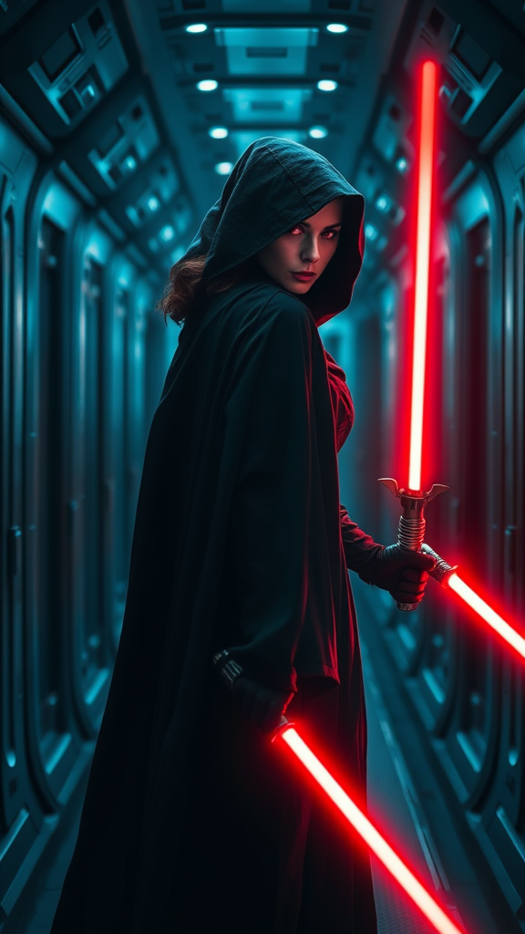 A formidable female Sith Lord with fiery red eyes stands in a dark, ominous spaceship hallway. Her black cloak billows slightly as she turns her back to the camera, exuding an aura of power and menace. In her right hand, she wields a glowing crimson lightsaber, poised at a 45-degree angle, casting an eerie red glow across her figure. Her expression, though unseen, is palpable with anger and intensity, as if she is about to unleash the fury of the dark side. The cold metallic walls of the corridor reflect the harsh light, amplifying the dark and foreboding atmosphere.