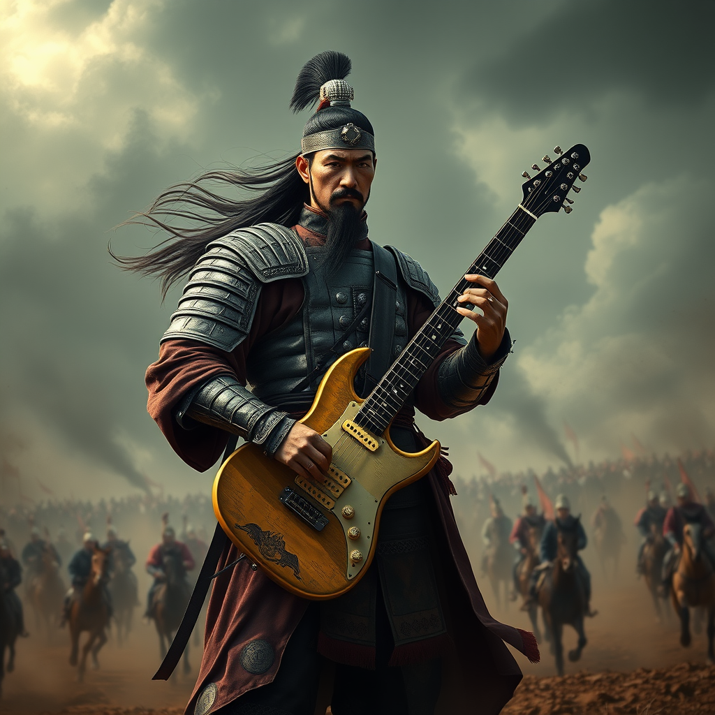 A formidable general from the Qin Dynasty stands on a vast battlefield engulfed in swirling dust and smoke, clutching an electrifyingly modern electric guitar. His armor gleams beneath the dim, war-torn sky. The panoramic scene captures the intensity of the moment, as his army on horseback forms a powerful backdrop. The general's eyes are fiercely focused, his long hair caught in the breeze, adding dynamic motion to the hyper-realistic portrait. The juxtaposition of ancient and modern elements infuses the image with a sense of timeless rebellion and unyielding spirit.