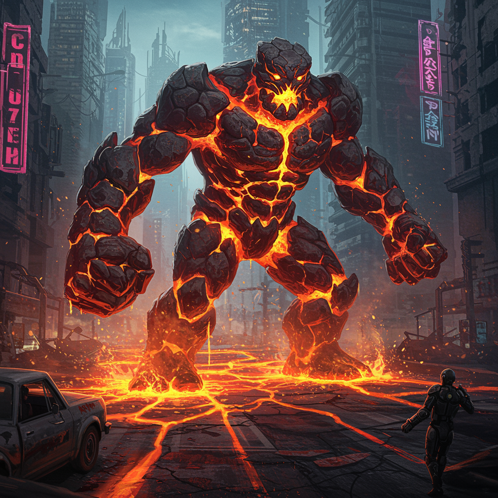 A formidable primordial lava golem towers over the devastated futuristic cityscape, with its molten interior pulsating visibly through fissures in its rocky exterior. In the midst of an intense battle, its blazing fists arc through the air, leaving trails of toxic fumes. Each step melts the hyper-modern alloys and advanced materials underfoot, while its fiery form casts an eerie glow on the metallic ruins and flickering neon signs. Streets buckle and warp in its path, molten rivers carving new channels through the chaos, painting a vivid contrast against the cold steel of towering skyscrapers.