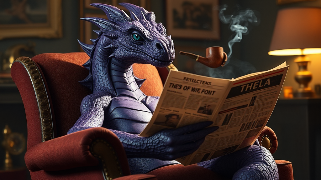 A formidable purple dragon with gentle, kind sapphire eyes and menacing spikes adorning its back reclines comfortably in a vintage armchair, a thin wisp of smoke curling from a smoldering pipe clutched in its talons. The creature immerses itself in reading a futuristic newspaper, its towering frame casting dramatic shadows in the warm glow of cinematic retro lighting.