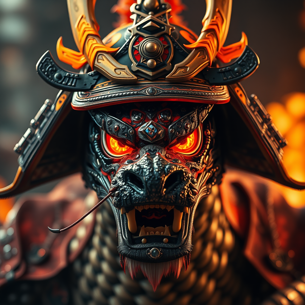 A formidable samurai dragon with blazing eyes emerges, its scales shimmering like crystal stones under the light. Adorning its head, a helmet with vibrant tiger hues enhances its fierce presence. Captured in a close angle with 8k ultra-realistic detail, the scene is illuminated by dramatic photography lighting that highlights every ultra-detailed texture, presenting a breathtaking photorealistic vision.
