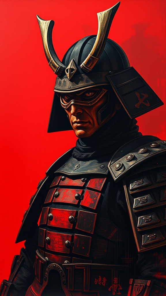 A formidable silhouette emerges against a vivid crimson backdrop, partially enveloped in shadow. This figure is clad in armor that evokes a samurai aesthetic, with segmented plates adorning the shoulders and upper arms. Its most striking attribute is a grotesque mask embellished with small horns and vacant eye sockets, imparting an eerie, supernatural aura. The mask and armor are depicted in rich charcoal and obsidian hues, offering a stark contrast to the intense red background. The piece conveys a strong sense of menace and enigma. Painted in possibly acrylic or gouache on paper or board, the artwork exhibits visible brushstrokes and textured applications, particularly within the red backdrop. The dramatic lighting further accentuates the dark figure against the vibrant red, and the close-up composition, focused on the figure's upper body, amplifies its dominating presence. The underlying atmosphere is enhanced with subtle variations in the red tones, which ebb into deeper shades, emphasizing the figure's enigmatic allure.