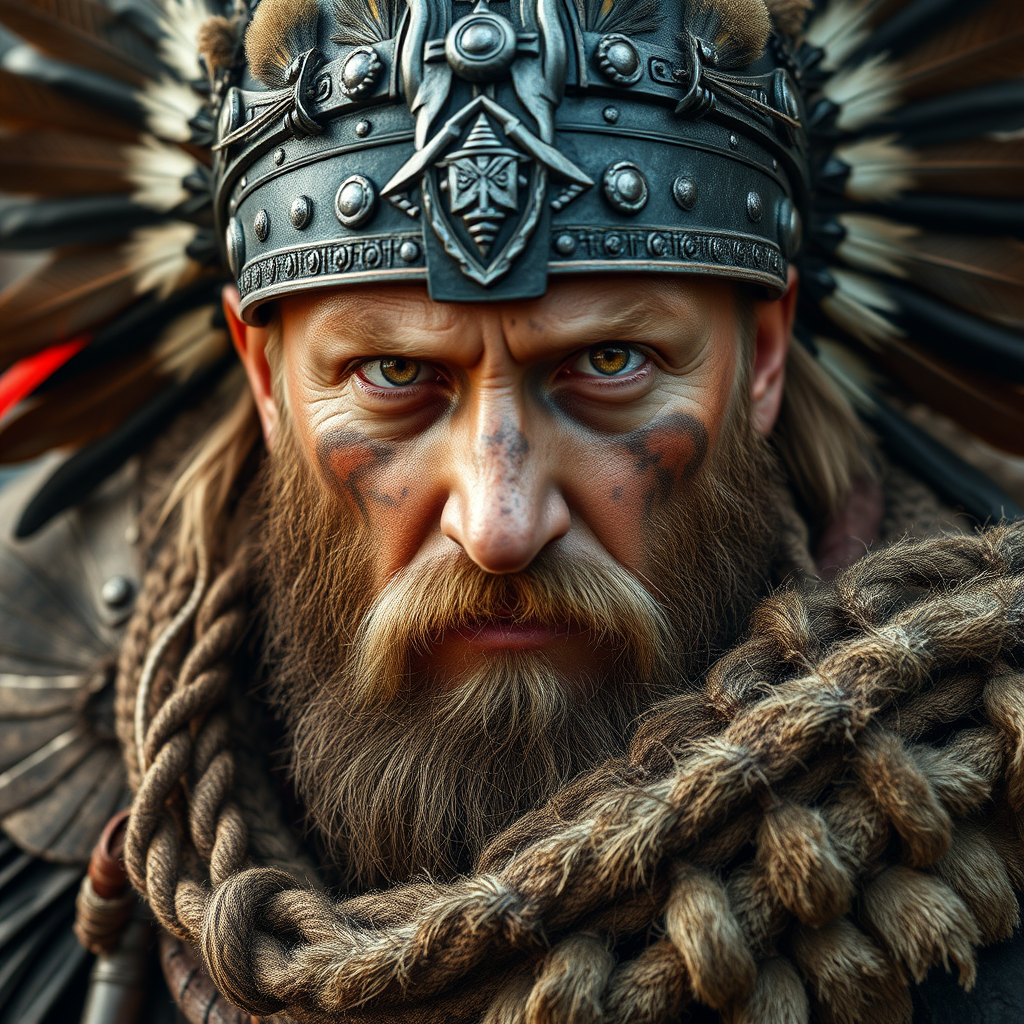 A formidable Viking warrior, with a timeworn face and striking bright brown eyes, flawless in their intensity, bears the marks of endless battles. His weathered skin tells tales of countless adventures, and intricately applied war paint highlights his fierce expression. Draped in a magnificent war bonnet adorned with feathers and symbols of victory, he strides homeward after the chaos of war. The scene captures every minute detail in ultra-realistic, 8k clarity, enhanced by an octane render that brings his formidable presence to life, with subtle changes of scars, fresh yet familiar, reflecting both the poignancy of survival and anticipation of homecoming.