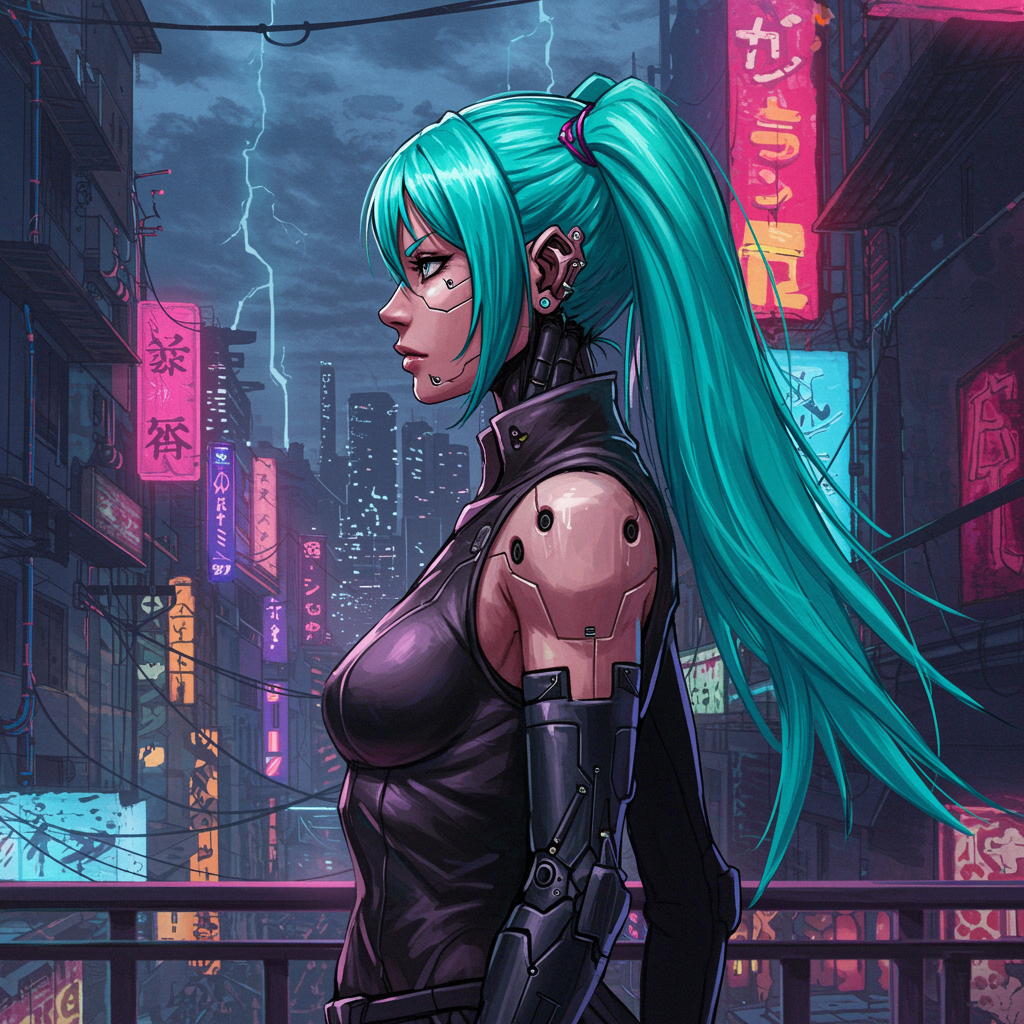 A formidable woman adorned with cybernetic enhancements and vibrant turquoise hair, depicted in side profile amidst the neon-lit sprawl of a dystopian Tokyo. She wears sleek, futuristic attire that melds technology with style, embodying strength and innovation. The atmosphere is painted with a moody, overcast sky, emphasizing the city's gritty, electric ambiance. The scene is intricately rendered with detailed line work, capturing the essence of manga aesthetics. The colors are bold and dynamic, utilizing cell shading reminiscent of classic comic prints, echoing the styles of Masamune Shirow and Hajime Shimomura. A digital painting that merges graphic novel sensibilities with a vibrant color palette, illustrating a rich narrative within the urban dystopia.
