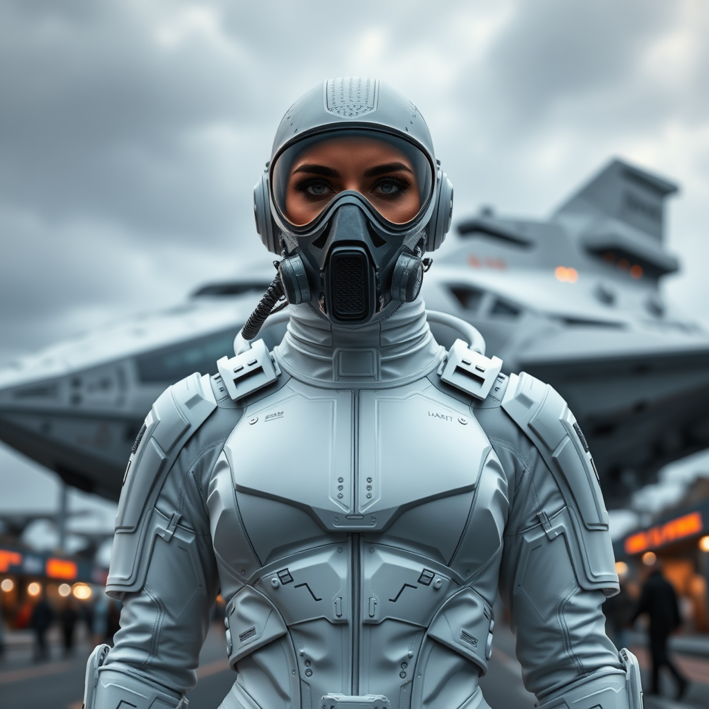 A formidable woman clad in a sleek, white sci-fi spacesuit stands with authority on a bustling spaceport. Behind her, a futuristic spaceship looms large against an overcast sky. Her visage is obscured by an advanced mask equipped with a sci-fi visor and respirator. Her bald head, accentuated by intricate plate armor, emanates strength and resilience. The scene is captured from a low third-person perspective, emphasizing her dominance. The spacesuit showcases exquisite detail, merging the sleekness of isolation armor with natural textures, rendered in hyper-realistic quality. The setting is reminiscent of a high-budget sci-fi film, employing cinematic techniques such as ray tracing and moody lighting to enhance its realism. The photograph is captured in 8K Ultra-HD, employing natural lighting and subtle blur to convey motion and depth, resulting in a vivid and immersive depiction.