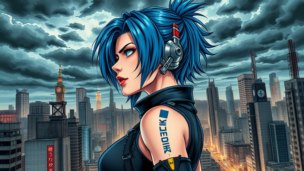 A formidable woman with cybernetic enhancements and vibrant blue hair, shown in a side profile. She wears futuristic attire set against the backdrop of a dystopian Japanese cityscape. The scene is highly detailed with a dark, brooding sky, showcasing intricate line work reminiscent of manga style, with cell shading and a graphic novel aesthetic. The digital painting captures her in a dynamic stance, drawing inspiration from the works of Masamune Shirow and Hajime Shimomura, blending both color illustration and comic print for a striking visual narrative.
