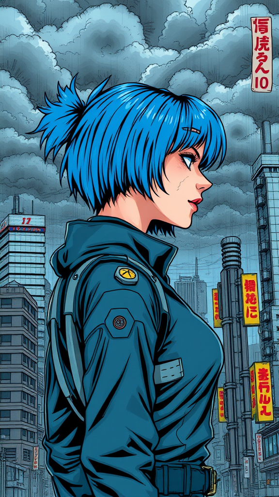 A formidable woman with cybernetic enhancements and vibrant blue hair, depicted in profile view, adorned in futuristic attire amidst the backdrop of a dystopian Japanese metropolis. The scene is intricately detailed with a dark, moody sky overhead, featuring complex line work reminiscent of manga style, utilizing cell shading to enhance depth. The composition reflects a comic print aesthetic, drawing inspiration from the distinctive styles of Masamune Shirow and Hajime Shimomura. It's a digital painting with vivid colors, set in an atmosphere that captures the essence of a graphic novel narrative.