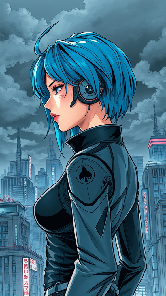 A formidable woman with cybernetic enhancements and vivid azure hair, depicted in a striking side profile. She dons sleek, avant-garde attire set against the backdrop of a dystopian cityscape reminiscent of Japan. The scene is meticulously detailed, under a foreboding, darkened sky. The artwork showcases intricate linework and a style that blends manga aesthetics with cell shading, reminiscent of a graphic novel. This digital painting captures the essence of artists like Masamune Shirow and Hajime Shimomura, offering a richly colored and immersive illustration. The image ratio maintains a dramatic 9:7 perspective, enhancing the character's imposing presence in this futuristic world.