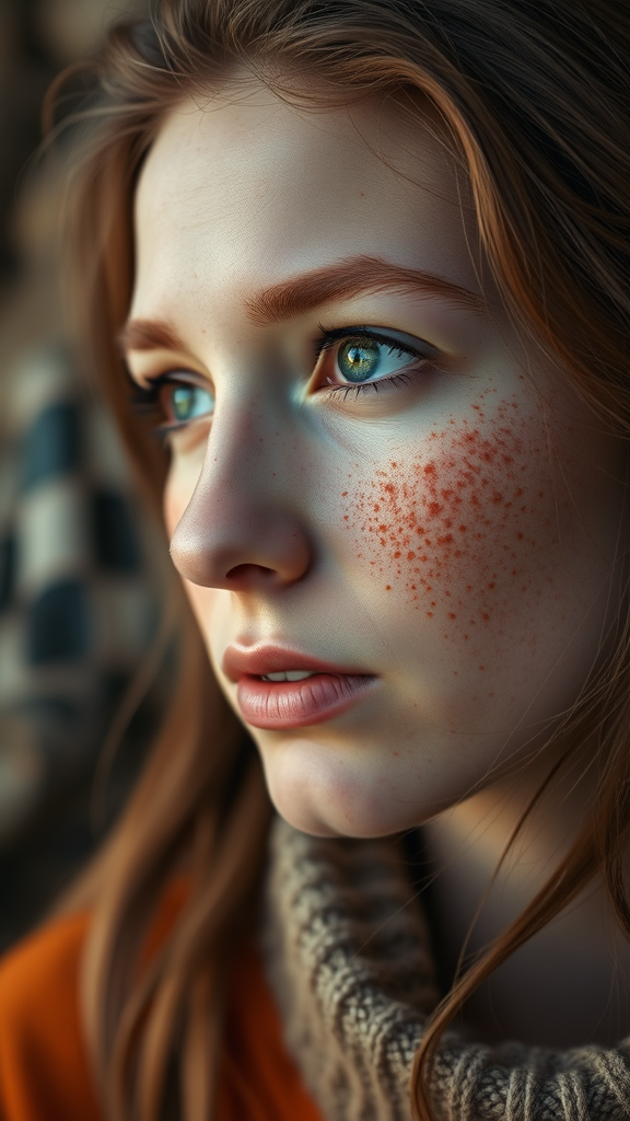 A freckle-faced woman gazes thoughtfully into the distance, capturing the essence of a vray-inspired scene with a palette of white and orange, exuding a warmcore ambiance. Her strong facial expression is highlighted in a photobash style, bridging reality and artistic flair. The photo embraces a fawncore aesthetic, blending natural elements with a touch of whimsy, creating an atmospheric portrait.