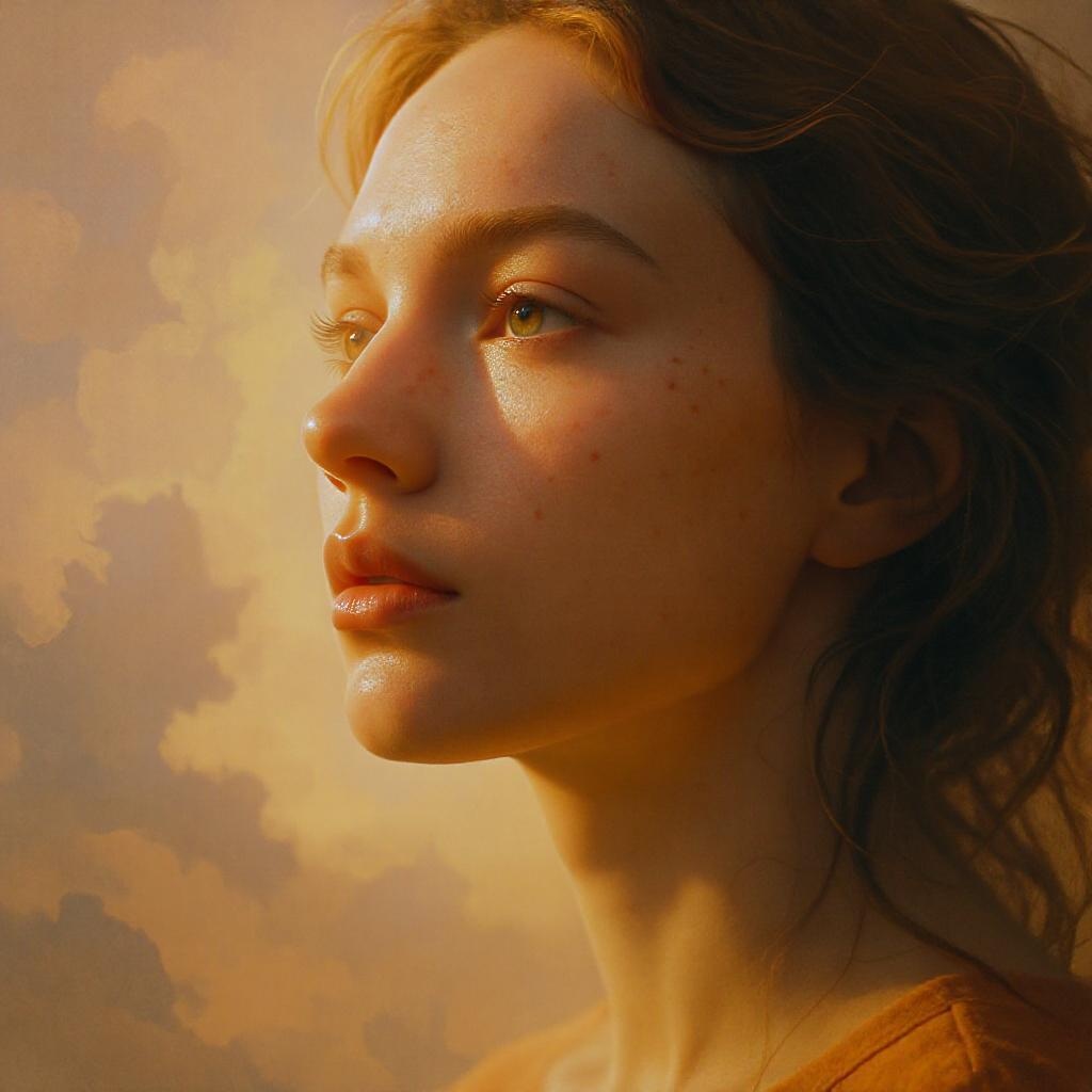 A freckled woman gazes contemplatively into the distance, her face illuminated by soft, warm hues of white and orange, evoking a sense of warmth and introspection. Her expression is powerful and emotive, capturing the spirit of strong resolve. The scene is styled with a blend of photorealism and artistic abstraction, reminiscent of a vray-rendered image intertwined with a photobash technique. The gentle play of light and shadow highlights her features, enveloping her in a fawncore-inspired ambiance that speaks to a quiet elegance and organic beauty.