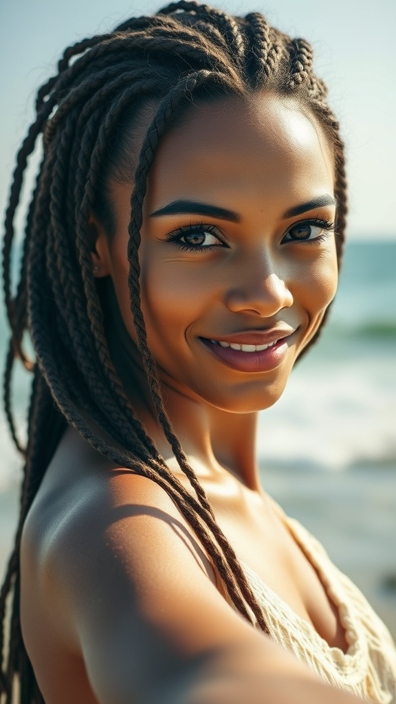 A free-spirited woman with intricately braided hair, exuding an enchanting natural beauty, gazes intently with eyes full of joy. She strikes a dynamic pose by the ocean, illuminated by the gentle embrace of soft natural light, capturing the essence of a carefree soul.