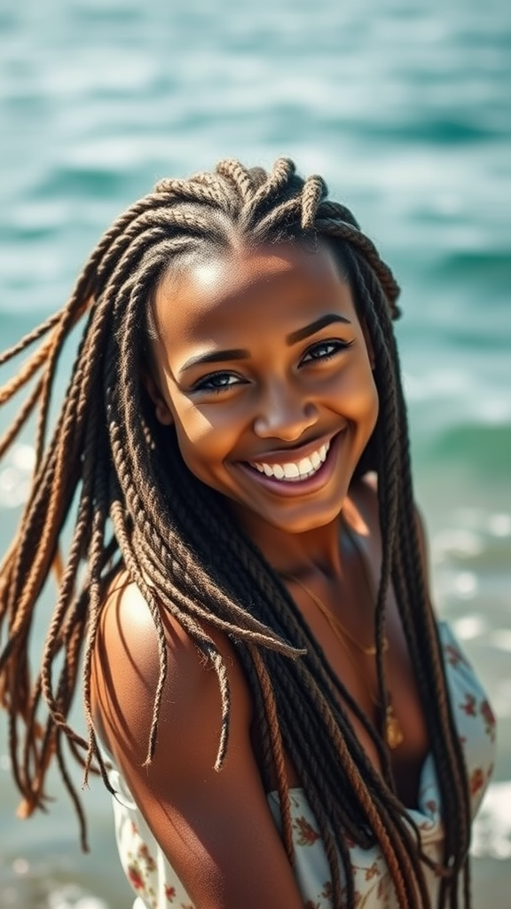 A free-spirited woman with intricately braided hair, exuding natural charm, captured in a vibrant portrait by the ocean. Her eyes are captivating, filled with joy and energy, as she strikes a lively pose. The scene is bathed in gentle natural light, emphasizing her joyful and spirited presence.