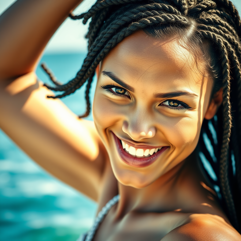 A free-spirited woman with intricately braided hair and an enchanting, natural beauty poses dynamically by the ocean. Her eyes are intensely focused yet filled with joy, her expression radiating pure happiness. The soft natural light accentuates her features, casting a gentle glow that complements the serene sea backdrop.
