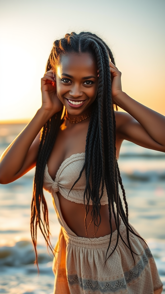 A free-spirited woman with intricately braided hair exudes a natural charm, captured in a portrait by the ocean. She strikes a dynamic pose, her eyes holding an intense yet joyful expression under the warm embrace of soft, natural light. The setting sun casts a golden glow, enhancing her radiant presence, with waves gently lapping at her feet.