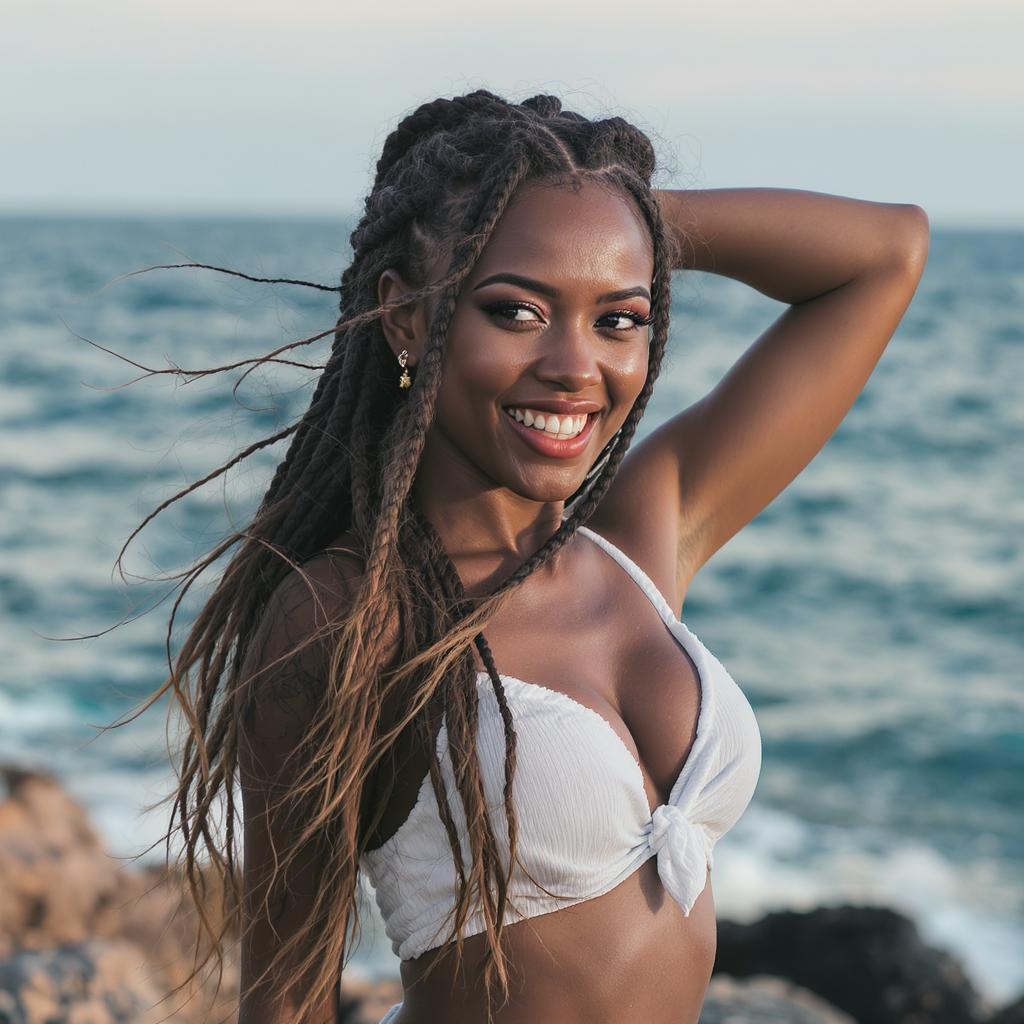 A free-spirited woman with intricately braided hair, radiating natural charm. Captured in a captivating portrait by the ocean, she strikes a dynamic pose with an intense, joyful expression. The scene is bathed in soft, natural light, accentuating her connection with nature and her lively spirit.