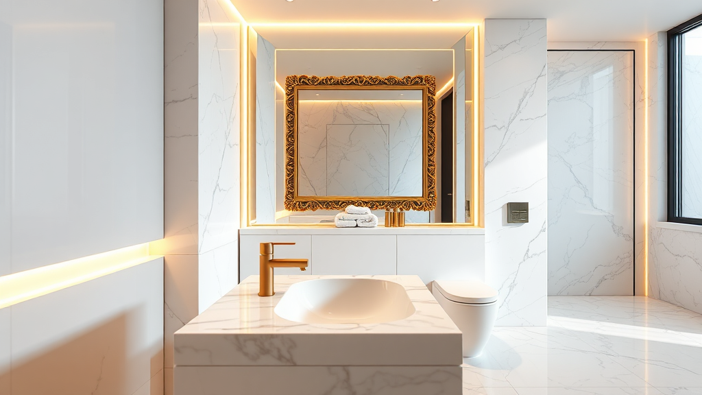A front-view perspective of a modern luxury bathroom interior showcases an elegant sink crafted from white marble, paired with a matte gold faucet. A sleek, wall-mounted toilet in polished white ceramic complements the luxurious theme. A prominent large mirror, adorned with a gold filigree frame, captures the opulent decor of the room. The floor and walls are adorned with expansive, white and grey veined marble tiles, enhancing the lavish aesthetic. Integrated soft LED lighting in the ceiling and behind the mirror casts a warm, inviting glow, creating a serene and opulent atmosphere. The image captures a harmonious blend of warm artificial light and natural daylight, accentuating the polished surfaces and refined lines characteristic of luxury bathroom design. Subtle embellishments, like an artfully arranged set of plush towels and a gold-accented soap dispenser, add to the exclusive ambiance, ensuring the core luxury concept remains intact while offering a fresh, creative interpretation.