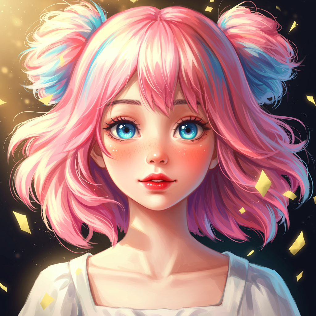 A front view portrait photograph features a cute, hopeful girl with cheerful red cheeks, set against a negative contrast background illuminated by glowing sunshine and natural light. The very strong front light accentuates her hyperdetailed, intricate flat color flying fluffy hair in symmetrical shades of pink and blue. Her delicate, beautifully detailed gloss lips complement her soft, smooth white skin, while her hyperdetailed, intricate anime blue eyes captivate in this masterpiece of best quality. The artwork draws inspiration from a Mary Cassatt style painting, with her clothes hyperdetailed in design. Many glowing tiny yellow papers float in the air, enhancing the scene, rendered with precise hard pencil and brush strokes for an album cover art aesthetic. This clean, colorful 2D vector illustration art, in flat colors, presents a glamorous composition at a stunning 128K resolution, capturing digital art and painting in vibrant, colorful ink illustration. The hyperdetailed sharp focus and digital illustration create a perfect composition, maintaining the essence while infusing subtle creativity.