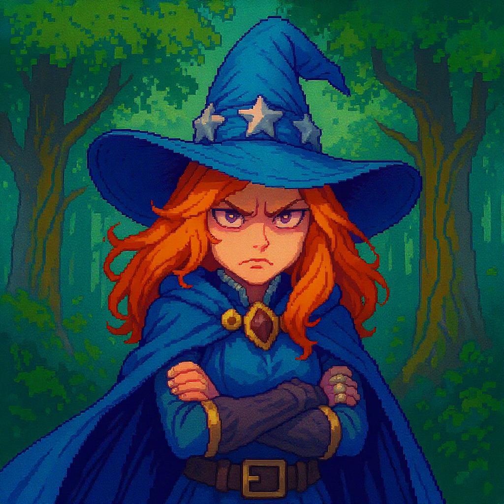 A frustrated witch with fiery orange hair stands in the forest, her arms defiantly crossed. She wears an azure pointy hat adorned with silver stars, a matching azure cape flowing behind her, and a sapphire blue cloak wrapped around her shoulders. Her piercing gaze is both intimidating and enchanting, capturing the mystic essence of the forest around her, portrayed in vibrant 64-bit pixel art.