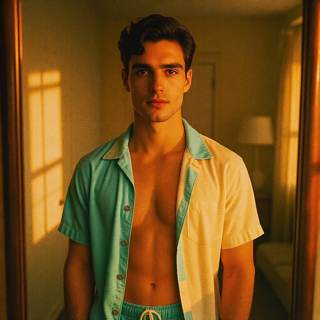 A full-angle shot captures a strikingly handsome man in stylish beachwear. The hyper-realistic photo, taken with the latest iPhone 14 in a mirror, showcases his short dark hair and captivating eyes. The setting is a cozy, luminous room bathed in the warm glow of golden hour. With the addition of ray tracing, the image pops with depth and clarity, enhanced by the nostalgic film grain reminiscent of Kodak Portra 800. The f/1.8 aperture beautifully blurs the background, drawing focus onto the subject, while capturing the essence of a perfect, tranquil moment.