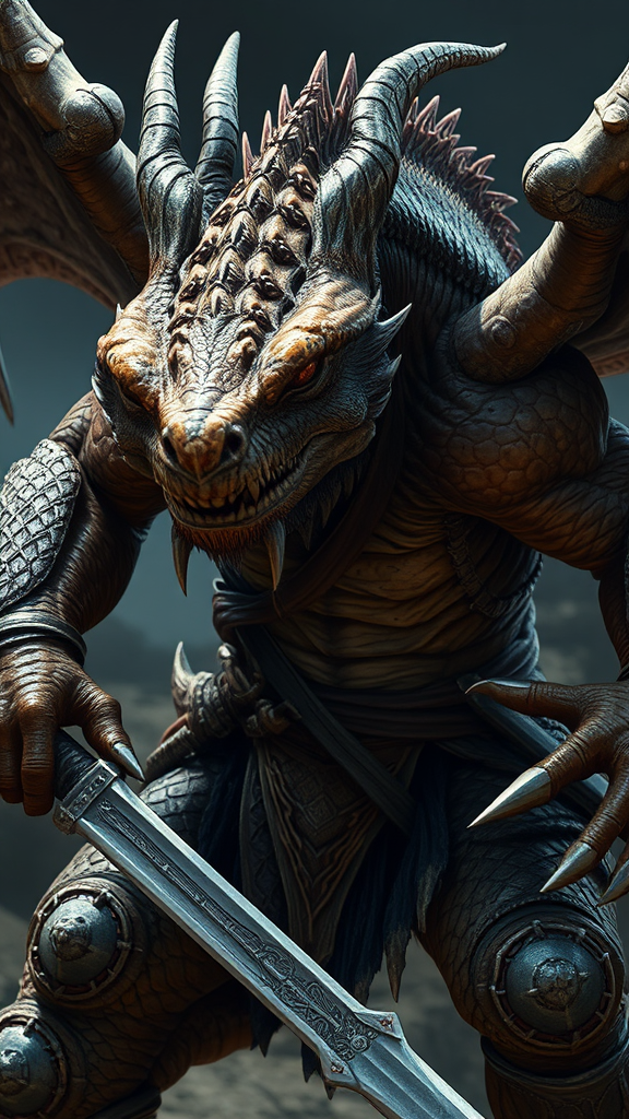 A full-bodied, engaged in intense combat, draconian warrior from the world of Dragonlance, a fearsome reptilian humanoid, poised for battle, detailed face with piercing eyes, Masterpiece quality, 8k resolution, photorealistic style, inspired by Jeremy Mann, Sandra Chevrier, and Maciej Kuciara. Featuring sharp, realistic details with authentic shadows, in a 3D representation. Negative elements include avoiding low resolution, abnormalities like more than five fingers or two arms, a beard, more than two hands, childlike features, inappropriate attire or nudity, NSFW content, cartoonish or comic elements, and any depiction of many horses or a single wing.
