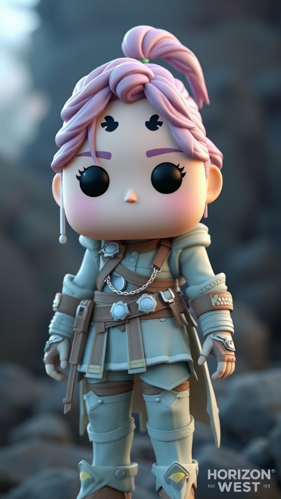 A full-body 3D render of Horizon Forbidden West's protagonist Aloy as a Pop Mart-style toy. The design features a blind box aesthetic with a sophisticated pastel color palette and resin material. The character exhibits soft pastel gradients with a highly detailed and expressive face. Rendered in 8K resolution using Blender and OC Renderer, the scene is enhanced by display lighting. The model showcases intricate clothing and gear details, maintaining a clay-like texture. The scene captures a dynamic and iconic stance, reflecting the adventurer spirit, set against an atmospheric backdrop.