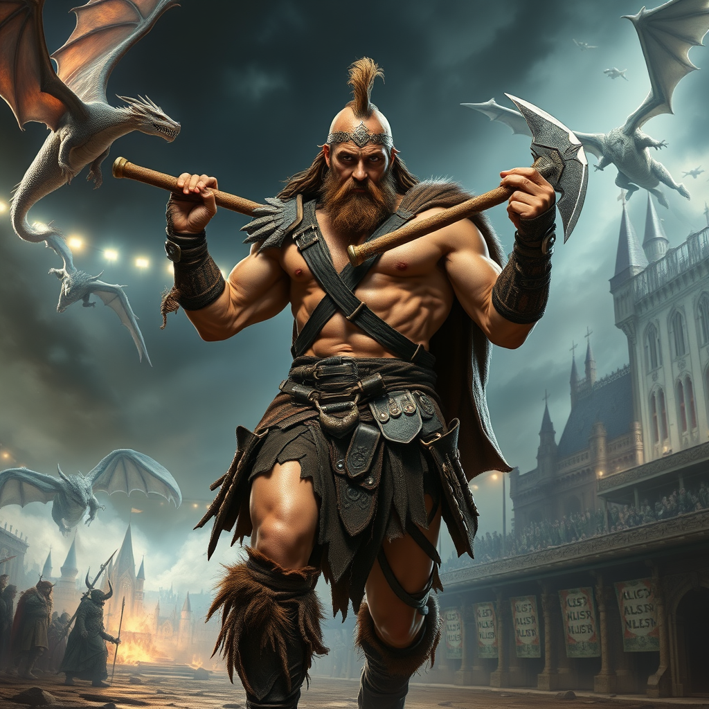 A full-body character portrait of a barbarian gladiator wielding a battle axe, showcasing extreme muscles and rugged, tattered attire. Set in a dramatic arena background under cinematic lighting, with intricate details highlighting the intense focus of the scene. Surrounding the arena are elements of fantasy: majestic dragons soaring above, elves observing from the stands, and grand castles in the distance. The atmosphere is charged with an aura of magic, blending the timeless fantasy world with subtle hints of modernity. Inspired by the artistic styles of Donato Giancola, Ruan Jia, Kekai Kotaki, Magali Villeneuve, and Even Mehl Amundsen, this depiction brings an epic, otherworldly dimension to life.