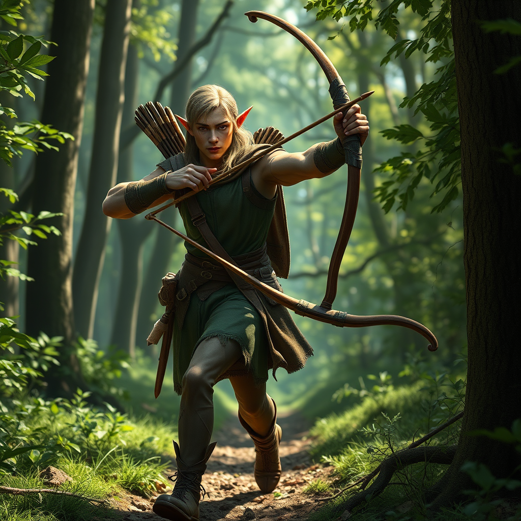 A full-body depiction features a male elf in a dynamic walking pose, drawing inspiration from Tanis of Dragonlance. He is an archer, seamlessly integrated into a lush forest environment. The vision captures a detailed face and expressive eyes, emphasizing realistic textures and lifelike features. The composition is a masterpiece of photorealistic quality, aspiring to 8k resolution, reminiscent of artwork by Jeremy Mann, Sandra Chevrier, and Maciej Kuciara. The scene is sharp and vivid with real shadows and 3D elements, balanced with a mature yet youthful model at a ratio of 0.7 mature attributes to 0.3 youthful attributes. The artwork embraces subtle creative modifications while maintaining the essence of the original concept.