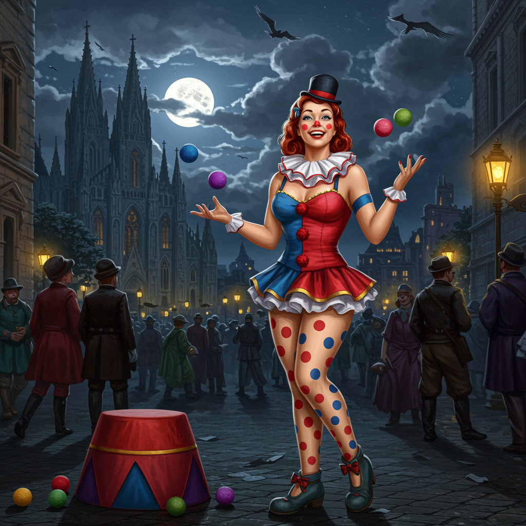 A full-body depiction of a cheerful young woman with a kind smile, exuding the spirit of a playful clown in a vibrant pin-up style. She stands gracefully amidst the hustle and bustle of a crowded city, her generous nature evident in her demeanor. A grand cathedral looms majestically in the background as she expertly juggles colorful balls, her form clad in eye-catching polka-dot leggings. An ominous sky looms overhead, the partially clouded night revealing a brilliant full moon. Bathed in dramatic volumetric lighting, the scene captures an essence of hyper-realism, reminiscent of an oil painting by Frank Frazetta.