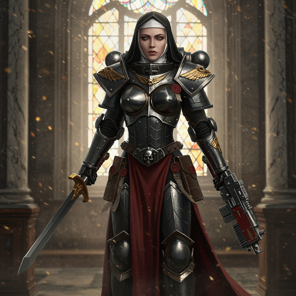 A full-body depiction of a devoted Sister of Battle set in an action scene, featuring a strikingly beautiful woman standing before an ornate stained glass window. Her symmetrical face is detailed with reflective eyes, dark eyebrows, and expertly applied makeup. She is adorned in sci-fi nun armor reminiscent of the Warhammer 40K aesthetic, set against marble walls illuminated by detailed, dramatic lighting that highlights dust particles in the air. The scene's lighting employs chiaroscuro techniques, creating a professional, majestic impression reminiscent of an oil painting by artists like Waterhouse, Constable, and Mann. The cinematic style draws inspiration from Studio Ghibli and Makoto Shinkai, with intricate high-detail elements trending on ArtStation and CGSociety. The steel and medieval armor echoes historical influences, while the overall composition avoids any low-resolution, disfigured, or awkward features, maintaining a coherent and visually captivating piece.