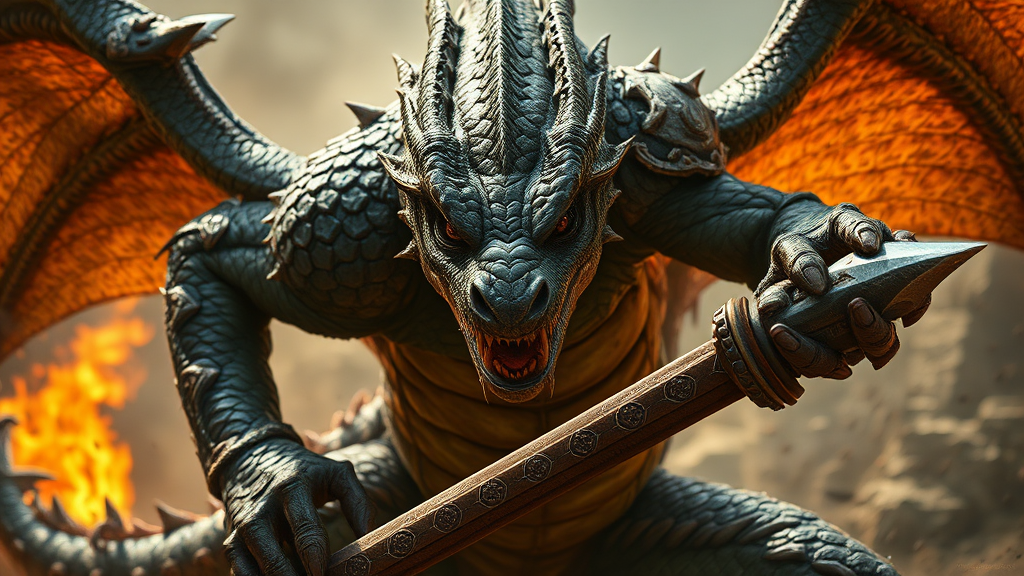 A full-body depiction of a fierce, draconian warrior engaged in intense combat. The reptilian humanoid exudes a fearsome presence, reminiscent of the Dragonlance saga. Its face is detailed with piercing eyes, capturing the essence of a masterpiece. The image is rendered in 8k photorealistic quality, influenced by the artistic styles of Jeremy Mann, Sandra Chevrier, and Maciej Kuciara. The scene is sharp and realistic, with authentic shadows giving it a 3D effect. The warrior's posture and expression convey strength and determination. This high-quality portrayal avoids low resolution and maintains anatomical accuracy, ensuring the depiction of two arms, two hands, and an absence of unnecessary elements. There are no childish features, inappropriate content, or cartoon-like qualities, which ensures a focus on realism and intensity.
