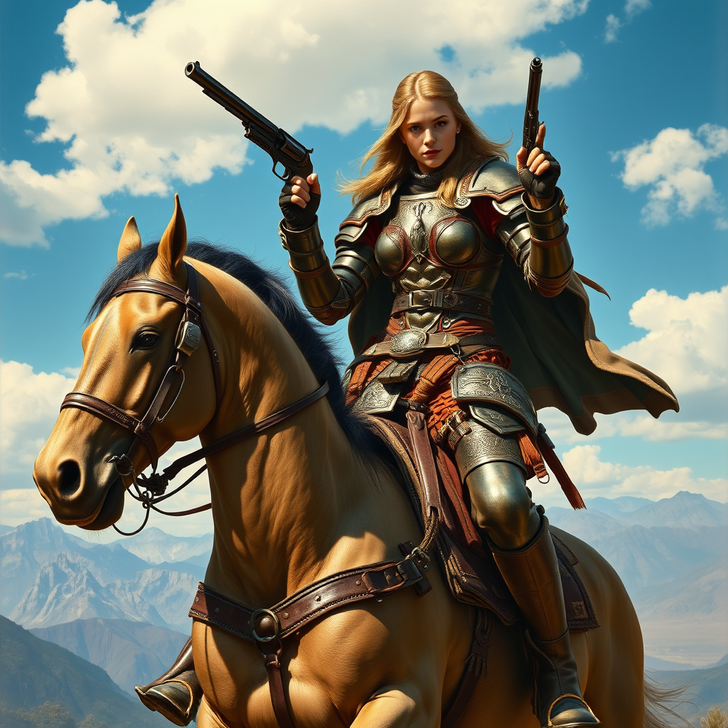 A full-body depiction of a fierce female warrior, clad in intricately detailed medieval armor, riding atop a majestic horse. She embodies the spirit of a cowboy, confidently gripping a flintlock pistol in one hand and a sleek revolver in the other. The background reveals a breathtaking panorama of majestic mountains under a vast, azure sky. This hyper-realistic oil painting, reminiscent of Frank Frazetta's mastery, captures the vibrant energy and timeless adventure of a bygone era with stunning high-resolution detail.
