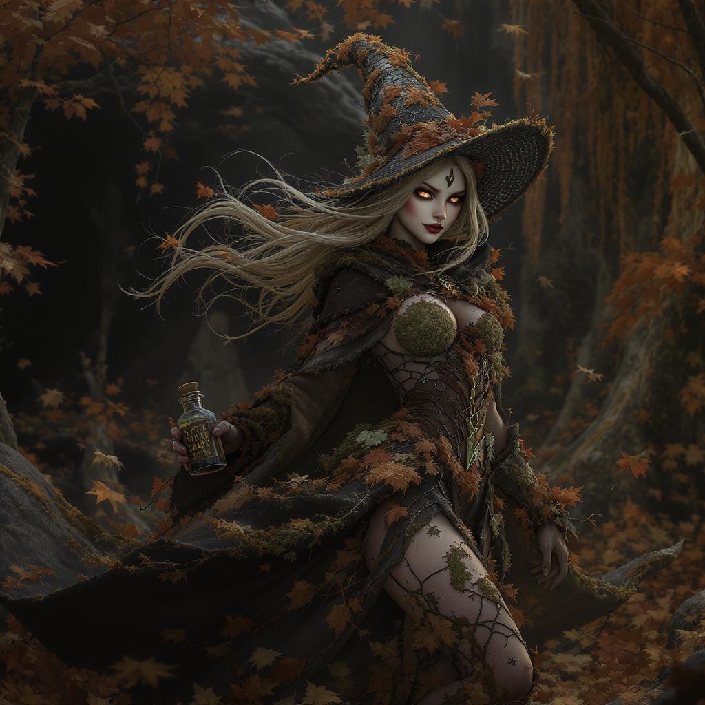 A full-body depiction of a girl wizard composed of autumnal foliage and plants, captured in a slow-motion dance pose. Her cloak, crafted from rich brown moss and dark leather, weaves intricate patterns across her form. In her hand, she holds a bottle of toxic spellcraft. The dark, moody universe around her is filled with a lush array of autumn-colored plant matter. This scene is rendered with insane detail and bloom, achieving the highest quality of digital art. The character is designed with incredibly sharp realism, featuring a beautifully detailed face and eyes, complete with detailed pupils. The art style is reminiscent of Chao Teng Zhao, brought to life in a photorealistic, intricate 3D shadow composition, capturing a perfect and realistic body. Set against a high-resolution 16k backdrop, the overall atmosphere is sharply defined, delivering a masterpiece of digital design.