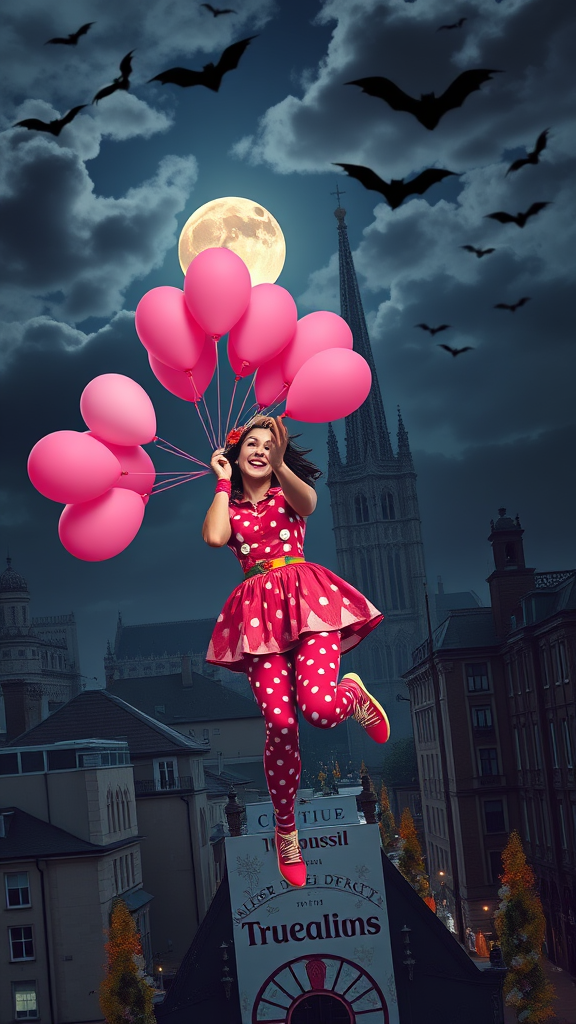 A full-body depiction of a joyful woman with a pin-up aesthetic, styled as a flying clown, gracing a bustling urban landscape. Her expression radiates kindness and generosity, as she holds a cluster of vibrant pink balloons. Embracing a playful look, she wears polka-dot leggings. An impressive cathedral looms majestically in the background. The scene unfolds under an ominous, partially clouded midnight sky, dominated by a full moon accompanied by silhouettes of bats in flight. Volumetric fog adds an ethereal quality to the night air. The cityscape, infused with hyper-realistic detail, evokes the grandeur and beauty of an Albert Bierstadt oil painting.