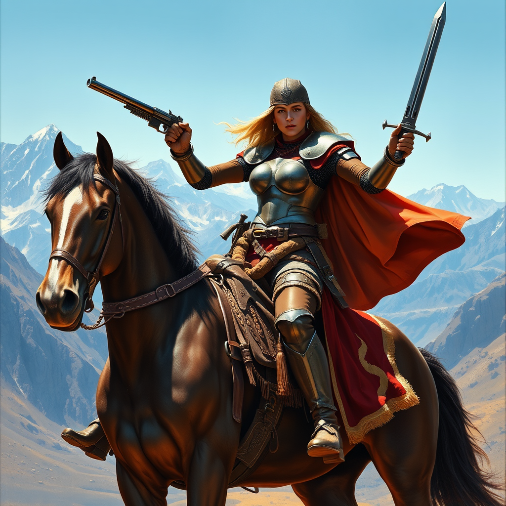 A full-body depiction of a knightly woman, blending the ruggedness of a cowboy with the elegance of medieval armor, astride a powerful steed. She confidently brandishes a flintlock pistol in one hand and a gleaming sword in the other. Behind her, majestic mountains rise under a vast expanse of clear blue skies. The scene is captured in high resolution, with a hyper-realistic style reminiscent of an oil painting by Frank Frazetta, emphasizing rich textures and dynamic contrasts.