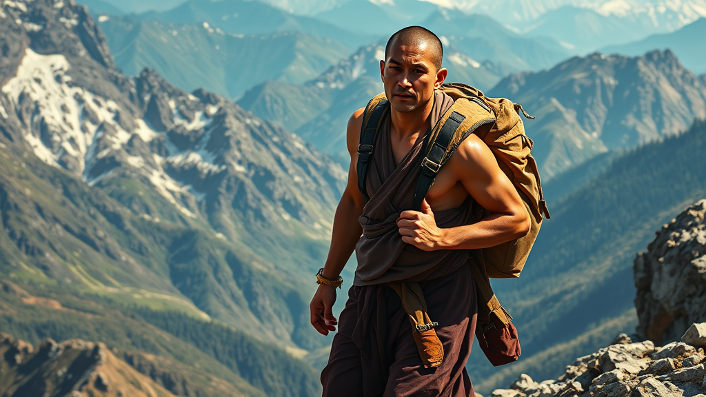A full-body depiction of a lean, muscular male monk, embodying the essence of a seasoned traveler with a well-worn rucksack slung over his shoulders. He gracefully scales the mountainous terrain, evoking the elegance of a geisha in motion. The mountains are reminiscent of Albert Bierstadt's majestic landscapes, viewed from a birds-eye perspective. The scene is rendered in rich, high-resolution hyper realism, echoing the dramatic and intense style of an oil painting by Frank Frazetta. The monk's determined expression and the vivid, expansive wilderness around him highlight a breathtaking, epic journey.