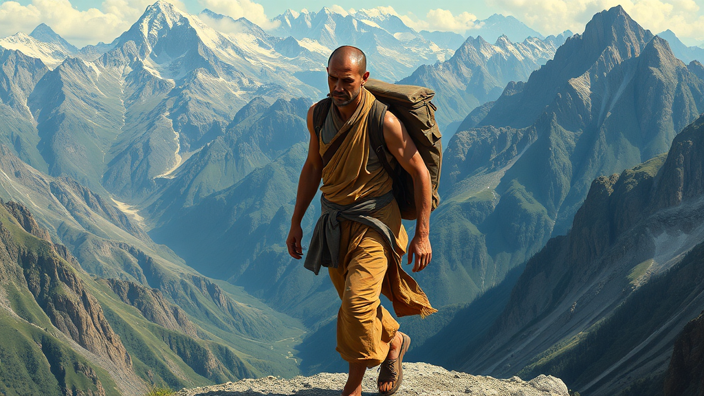 A full-body depiction of a lean yet muscular male monk journeying through majestic mountains, embodying the grace of a geisha in his movements, with a well-worn rucksack slung over his shoulder. The mountainous landscape around him is reminiscent of Albert Bierstadt's grandeur, seen from a birdseye perspective, capturing the vast expanse in hyper-realistic detail. This scene is rendered with the dramatic intensity and vivid oil painting style of Frank Frazetta, highlighting the monk's resolve and the wild beauty of his path.