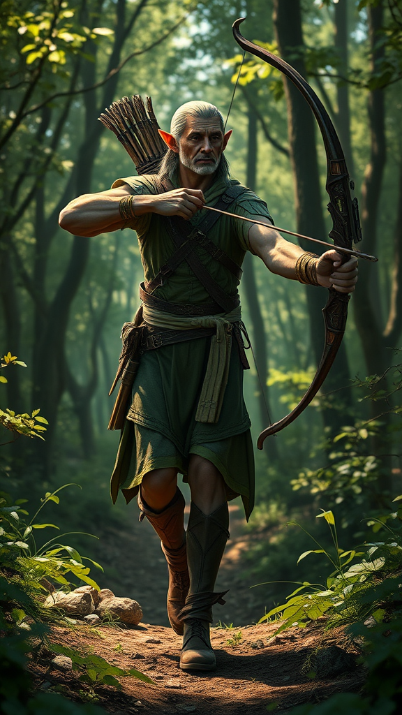 A full-body depiction of a male elf in a dynamic walking pose, reminiscent of Tanis from Dragonlance, depicted as an archer effortlessly blending with his natural surroundings in a lush forest. His detailed face and expressive eyes are captured in a photorealistic style, enhanced by the sharp and realistic shadows of the forest setting. The scene is rendered in stunning 8k quality, drawing inspiration from the styles of Jeremy Mann, Sandra Chevrier, and Maciej Kuciara. This masterpiece integrates elements of 3D design, showcasing the elf's graceful movement and the intricate details of his attire and archery equipment, with subtle creative modifications that expand upon the core essence of this enchanting character.
