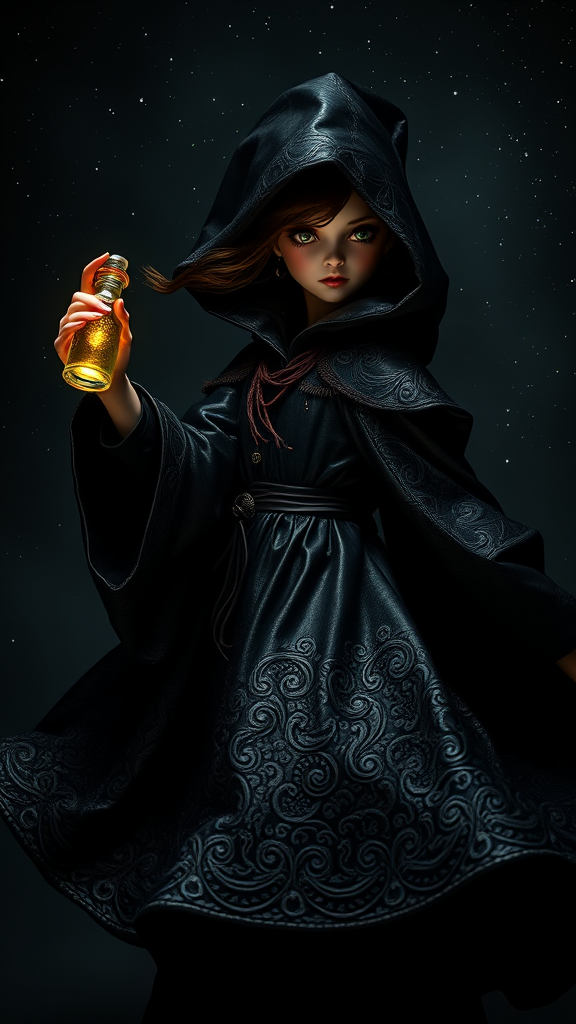 A full-body depiction of a whimsical and eerie young sorceress twirling gracefully, captured in slow motion. Her petite frame is enveloped in an intricately patterned dark leather cloak, glistening in the dim light. In her delicate hand, she conjures a toxic spell, a small glass bottle emanating an eerie glow. The background is a dark, moody cosmos, each star a pinprick of light in the blooming darkness. The scene is breathtakingly detailed, captured in stunning clarity at 8k resolution. Her face and eyes are meticulously depicted, with detailed pupils that reveal depth and emotion. The artwork is a digital masterpiece marked by sharpness, a perfect form, and realistic textures, featuring complex shadows that add mesmerizing depth. This highly detailed visual is inspired by the exquisite style of Chao Teng Zhao, presented in a 2:3 aspect ratio with an intense focus on quality and realism, rendering a photorealistic and perfectly composed image.