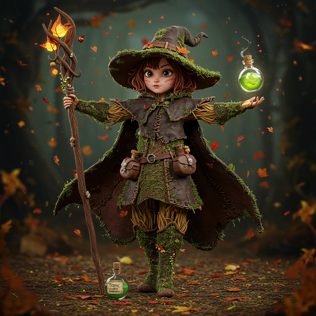 A full-body depiction of a young girl wizard intricately crafted from autumn foliage and flora, her form captured in a slow motion dance pose. She exudes a slightly eerie aura, attired in a cloak stitched from dark leather and brown moss, forming elaborate patterns across its surface. Beside her, a bottle of toxic spellcraft rests ominously. The scene is set against a brooding universe backdrop, alive with richly hued autumnal plant matter. Every element is rendered with striking detail, creating a sense of bloom and depth. The image boasts exceptional sharpness and photorealism, highlighting her meticulously designed face and expressive eyes. This masterpiece is imagined in a 3D style, infused with the artistic essence of Chao Teng Zhao. The environment is enriched with intricate shadows and textures, enhancing the realism and perfect anatomy of the character.