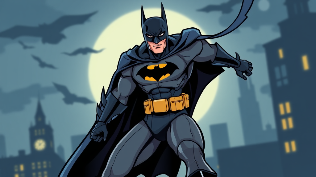 A full body depiction of Batman in a cartoon comic style, showcasing a dynamic pose with sleek lines and rich colors in an 8K resolution. The scene captures Batman mid-action, with his cape billowing dramatically, adding a sense of movement. His expression is focused and intense, embodying determination. The detailing is minimal yet effective, emphasizing the iconic elements of his suit, like the bat emblem and utility belt. The background features a glimpse of Gotham's night skyline, enhancing the atmosphere of the vigilante's domain. The overall composition highlights Batman's agility and strength, maintaining the core essence of the character with small creative tweaks to add a fresh perspective.