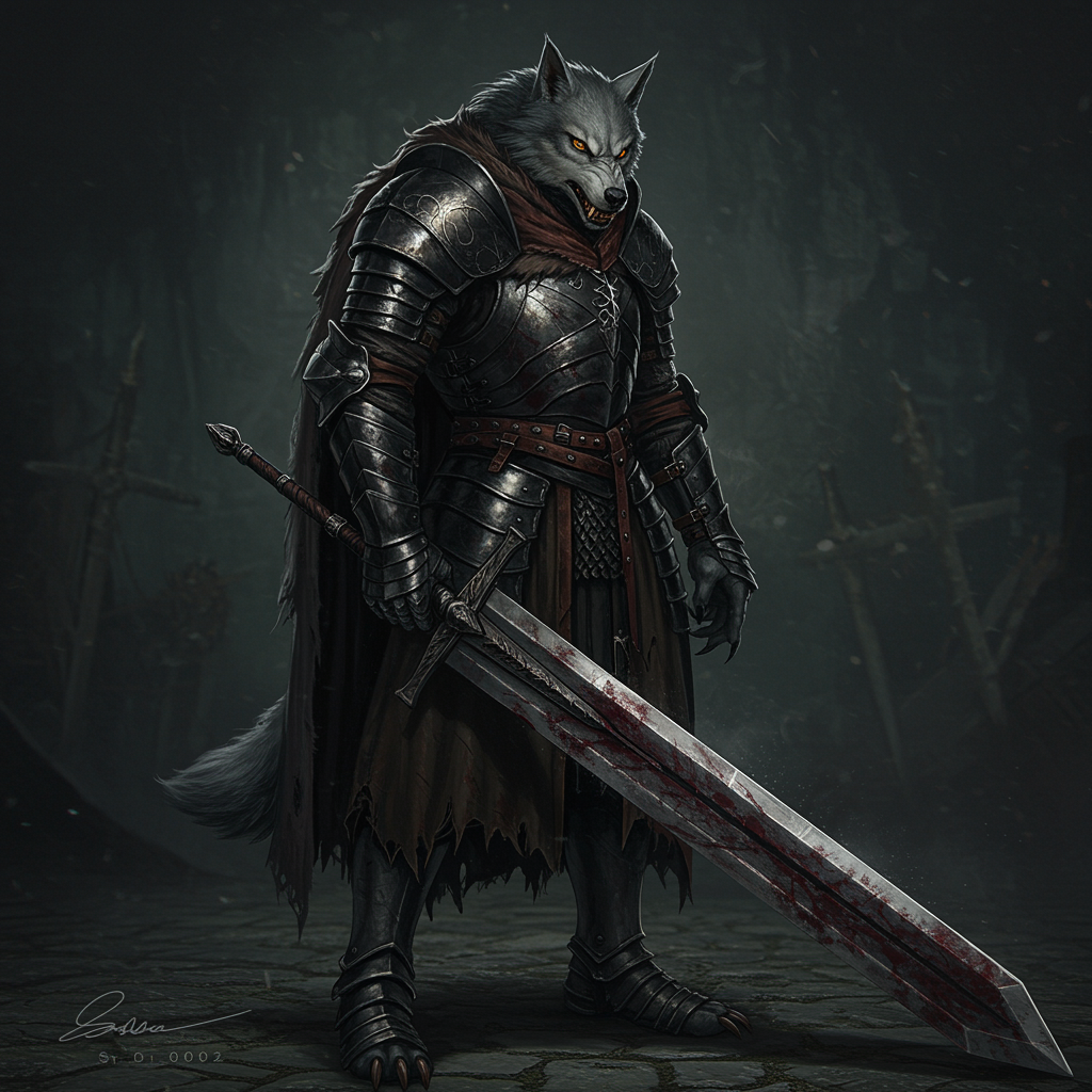 A full-body depiction of Blaidd, the werewolf from Elden Ring, featuring a powerful and imposing werewolf wielding a massive sword. Dressed in dark, intricately detailed armor, the scene captures a dark fantasy ambiance reminiscent of Elden Ring. The lighting is realistic and cinematic, highlighting the hyper-detailed digital art of Blaidd's perfect anatomy and the detailed features of his snout. While maintaining the essence of the character, some creative alterations are made. The background is slightly blurred, creating a sense of movement and focus on Blaidd. Elements of normal and low-quality textures are present, giving the artwork a rugged, authentic feel. Despite the intricate details, there are minor imperfections such as slight distortions in hand proportions, adding to the raw aesthetic. Signature elements, such as a faint watermark or artist name, subtly blend into the composition, enhancing the artwork's narrative.
