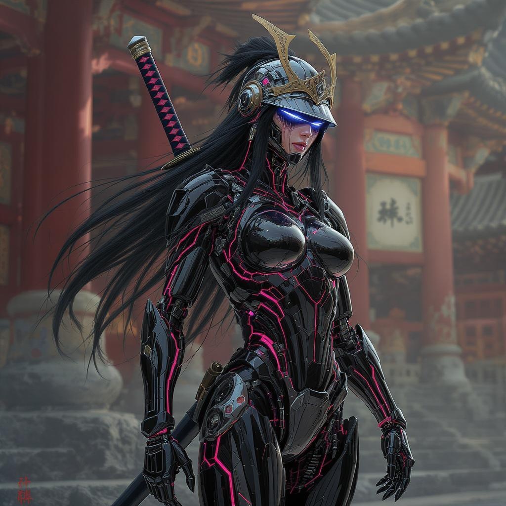 A full body depiction showcases a female cyberpunk robot samurai, her visage a fusion of machinery and mystique with a mirrored face shield. Her helmet brims with intricate details, concealing her flowing black hair that cascades down like liquid shadow. Encased in an armor of reflective black interwoven with neon red lines, she emanates an aura of futuristic elegance. Her form, crafted from sleek metals intertwined with cables and wires, highlights her robotic joints, capturing the essence of advanced cybernetics. She stands barefoot, embodying a silent grace, with a katana securely fastened to her back, ready for battle. The background suggests the abstract grandeur of an eastern temple, intertwining traditional elements with a cybernetic twist, casting an otherworldly atmosphere around this enigmatic warrior.