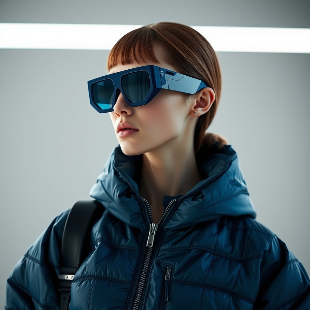 A full-body fashion shoot featuring a futuristic girl dressed in a collaborative collection by Jacquemus and Moncler. She wears dark blue translucent sunglasses with a sleek, avant-garde design. The setting captures the hyper-realistic details and vibrant textures of the outfit in stunning 8k resolution, showcasing intricate patterns and fabrics. The atmosphere is modern and stylish, with a sharp focus on the innovative fashion elements. The camera smoothly pans left, adding dynamic motion to the scene. The composition maintains the original futuristic vibe with a touch of creative elegance, highlighting a seamless blend of fashion and technology.