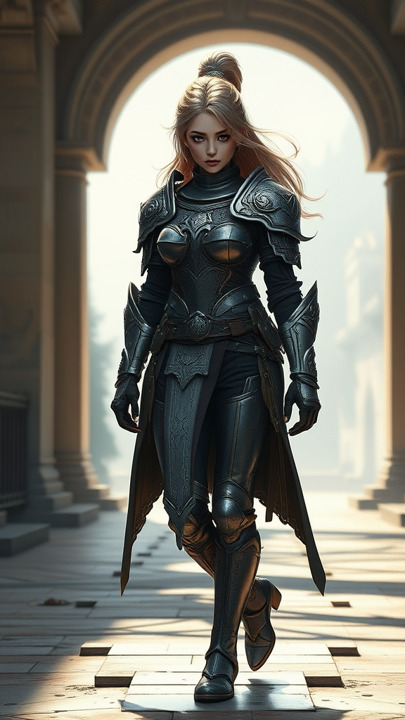 A full body female paladin in a slow-motion walking pose, clad in intricately detailed armor, her face and eyes capturing a striking realism and depth. The scene is a masterpiece of photorealism, rendered in stunning 8k quality, inspired by the artistry of Jeremy Mann, Sandra Chevrier, and Maciej Kuciara. The sharp details and realistic shadows bring her to life in a captivating blend of 3D and anime influences, with a subtle hint of hand-drawn sketches, presenting a dynamic fusion of styles without sacrificing quality or detail.