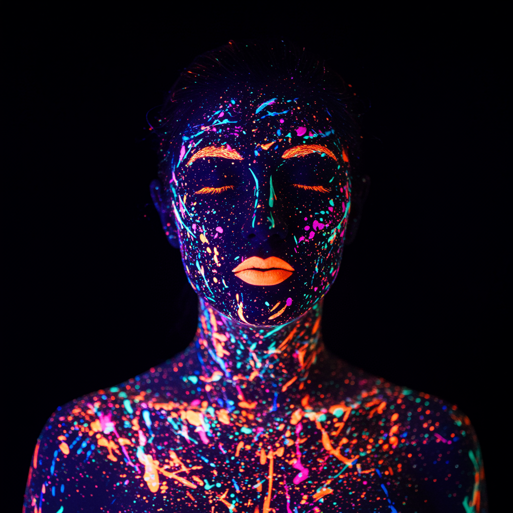 A full-body highly detailed portrait of a woman with her face and upper body adorned in splashes of neon, fluorescent paint that glows vividly under UV blacklight. Her eyes are gently closed, her expression tranquil and peaceful, as vibrant colors—luminous pinks, purples, oranges, and blues—cascade over her skin. The glowing paint forms abstract patterns across her face, neck, and shoulders, with specks and streaks of bright neon colors intensifying the ethereal atmosphere. The UV light dramatically illuminates the fluorescent paint, making the colors pop against a nearly pitch-black backdrop. The stark contrast between neon hues and shadows enhances the glowing effect of the paint, giving the image a surreal, otherworldly aura. The texture of the paint is crisp and detailed, while the soft lighting accentuates her facial contours, creating an elegant interplay of light and shadow. The overall ambiance is artistic, futuristic, and enchanting, with a focus on the vibrant, glowing colors and the serene expression of the woman.